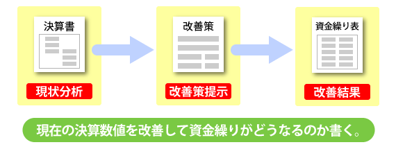 現在の決算数値をもとに現状分析から経営課題を書いて、その改善方法を具体的に数値を交えて書き、実行後の決算数値を書いて、改善結果を資金繰り表として書きます。 |