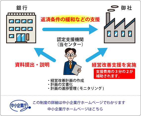 | 平成25年3月8日より、金融円滑化法の出口支援として、経営改善支援センターによる支援事業が開始しました。この事業は、メインバンクの承認を受けて経営改善計画書を作成し、実行する場合に、経営改善計画書の作成や作成後の検証(モニタリング)を認定支援機関が行った場合には、認定支援機関に支払う費用の3分の2(最大200万円)を経営改善支援センターが補助するというというものです。 |