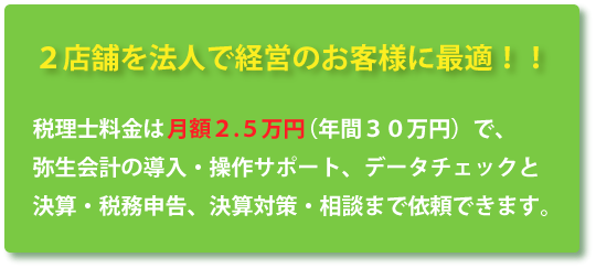 | FC店舗の場合は、業績把握などは店舗のPOSによって本部SVと相談されていることでしょう。税理士には、決算前に一度データチェックを依頼して、決算対策をすれば十分です。 |