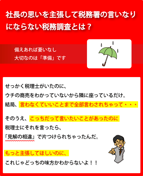 | 調査官が「持ち帰り」とした事項がある場合には、再度質問等が行われ、臨場時に調査官に提示した資料に追加があれば提示し、口頭又は資料提示によって、徹底的に主張します。 |